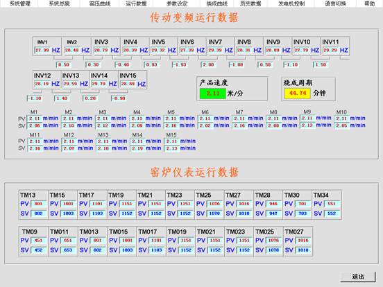*精准的控制。定制开发的“烧成曲线”和“自动加载窑炉设定温度配方”很好地实现了对生产线的精准的控制。精准的控制窑炉温度对瓷砖的质量起着非常重要的影响,通过该空间可以方便地对比观察窑炉上(下)部各设定温度值与运行温度值之间的差异变化,随时调节运行温度值,尽量与设定温度保持一致,保证窑炉烧出来的瓷砖达到质量合格要求。另一定制开发的“发电机自动检测控件”能保证窑炉配套的发电机一直处于良好的待机状态。通过该控件确保发电机一切正常,一旦停电就可立即给窑炉供电,保证生产。